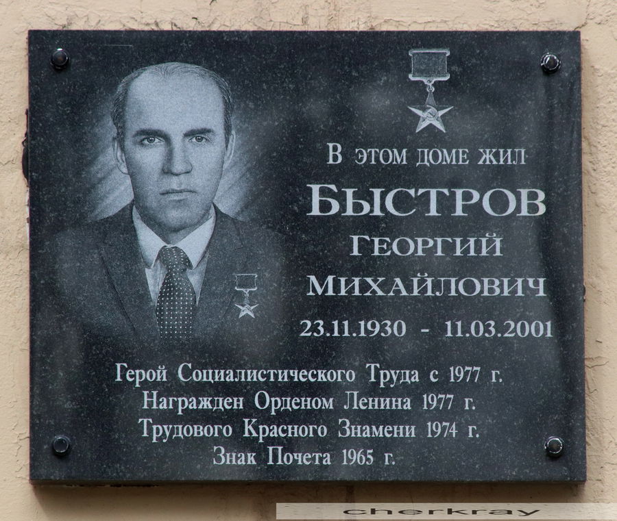 Мемориальная доска в память Г. М. Быстрова установлена на фасаде жилого дома по улице Бульвар Доменщиков № 39А в июне 2023 года.