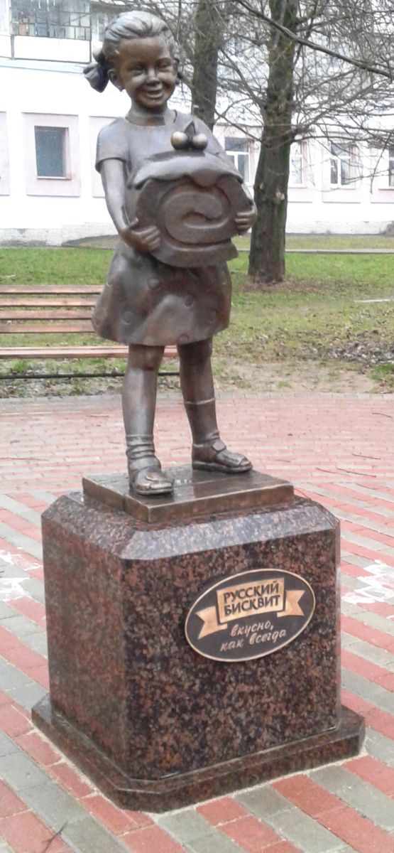 Скульптура маленькой улыбающейся девочки с задорными бантиками, в платье в горошек, прижимающей к себе большой кусок бисквита с двумя вишенками сверху, выполнена из бронзы, покрытой искусственной патиной для защиты от негативного атмосферного воздействия и биологических загрязнений; она закреплена на поверхности, стилизованной под деревянный «бабушкин» пол. Постамент, на котором стоит фигура девочки, сделан из полированного дымовского гранита красных оттенков. На постаменте – овальная пластина с надписью «Русский бисквит. Вкусно как всегда». Автор произведения – скульптор из Омска Виталий Шевченко. Вокруг скульптуры создана зона отдыха: уложена тротуарная плитка, установлены садовые скамьи с изящными металлическими боковинами. Открытие объекта состоялось 6 сентября 2019 года.