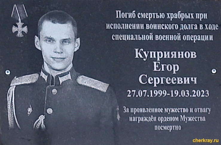Мемориальную доску в память о погибшем в ходе СВО выпускнике школы № 10 города Череповца Егоре Сергеевиче Куприянове открыли 8 декабря 2023 года. Памятная доска установлена на главном фасаде школы № 10 (улица Краснодонцев, 66).