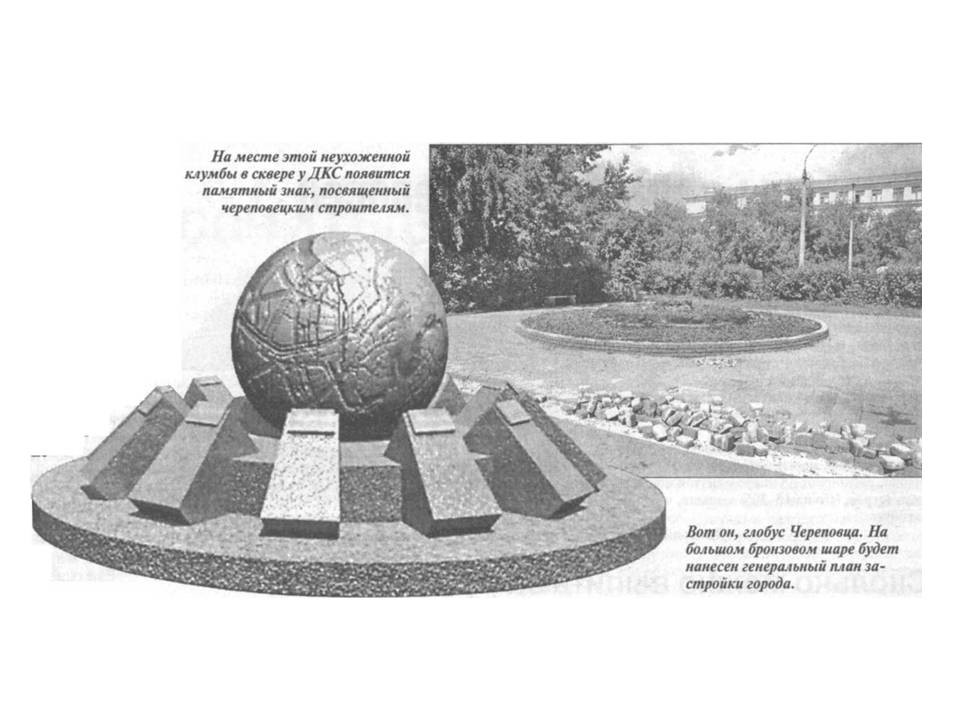Теперь немного о самом знаке. Это большой - два метра в диаметре и весом около тонны - бронзовый шар с выгравированным на нем генпланом застройки Череповца. То есть, по большому счету, глобус нашего города. Каждый, кто приблизится к нему, сможет отыскать на поверхности шара свою улицу, а может быть, и квадратик, символизирующий его дом. Не удивлюсь, если вскоре у молодоженов появится традиция нести цветы не к дедушке Ленину, а вот к этому многообещающему шару. Такое символичное – «жертвоприношение»: ну как вдруг желание сбудется, и на глобусе обозначится адрес их собственного жилья?! Изготовкой бронзового глобуса занимается санкт-петербургская фирма ООО "ЛАД" во главе с Александром Ковнатором. В настоящее время уже изготовлена так называемая мягкая форма. То есть проект знака воссоздан во всех деталях в пластичном материале. Дело за «малым» - покрыть форму бронзой. Между прочим, это очень непростая работа. Ведь глобус будет пустотелым, и слой бронзы не составит и 2 сантиметров. Но охотникам за цветными металлами не стоит беспокоиться: легче он от этого не станет. Тонна металла - вес весьма значительный. Закрепят шар намертво на гранитном основании, а для еще большей зрительной устойчивости снабдят двенадцатью гранитными лепестками. На них будут прикреплены таблички с названиями городских строительных организаций, а на некоторых укажут даты, наиболее значимые для развития череповецкого строительно-монтажного комплекса. Все для того, чтобы горожане наконец-то узнали, кто обеспечивает их жильем. Или с кого, если что, спросить можно... Благоустройство сквера