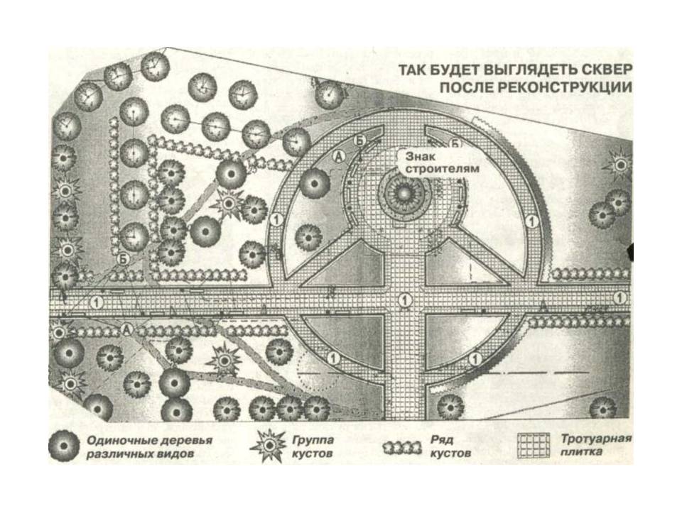 На «Плане расположения малых архитектурных форм и переносных изделий, покрытий и озеленения», подготовленном «Промжилпроектом», отчетливо видны изменения, которые произойдут на площади Строителей. Появятся новые, облагороженные серой плиткой размером 115x115 мм тропинки. Широкие дорожки, ведущие к бронзовому глобусу от трех входов в сквер, будут выложены такой же плиткой. Ограда останется прежней, но ее обновят и покрасят в антрацитово-черный цвет. Кустарники расположатся в приятном для глаза художественном беспорядке.