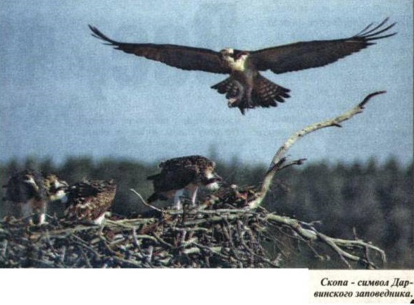 Символ Дарвинского заповедника - скопа, держащая рыбу в лапах. Скопа - одна из самых красивых хищных птиц мира. Она занесена в МСОИ и в Красную книгу РФ.
