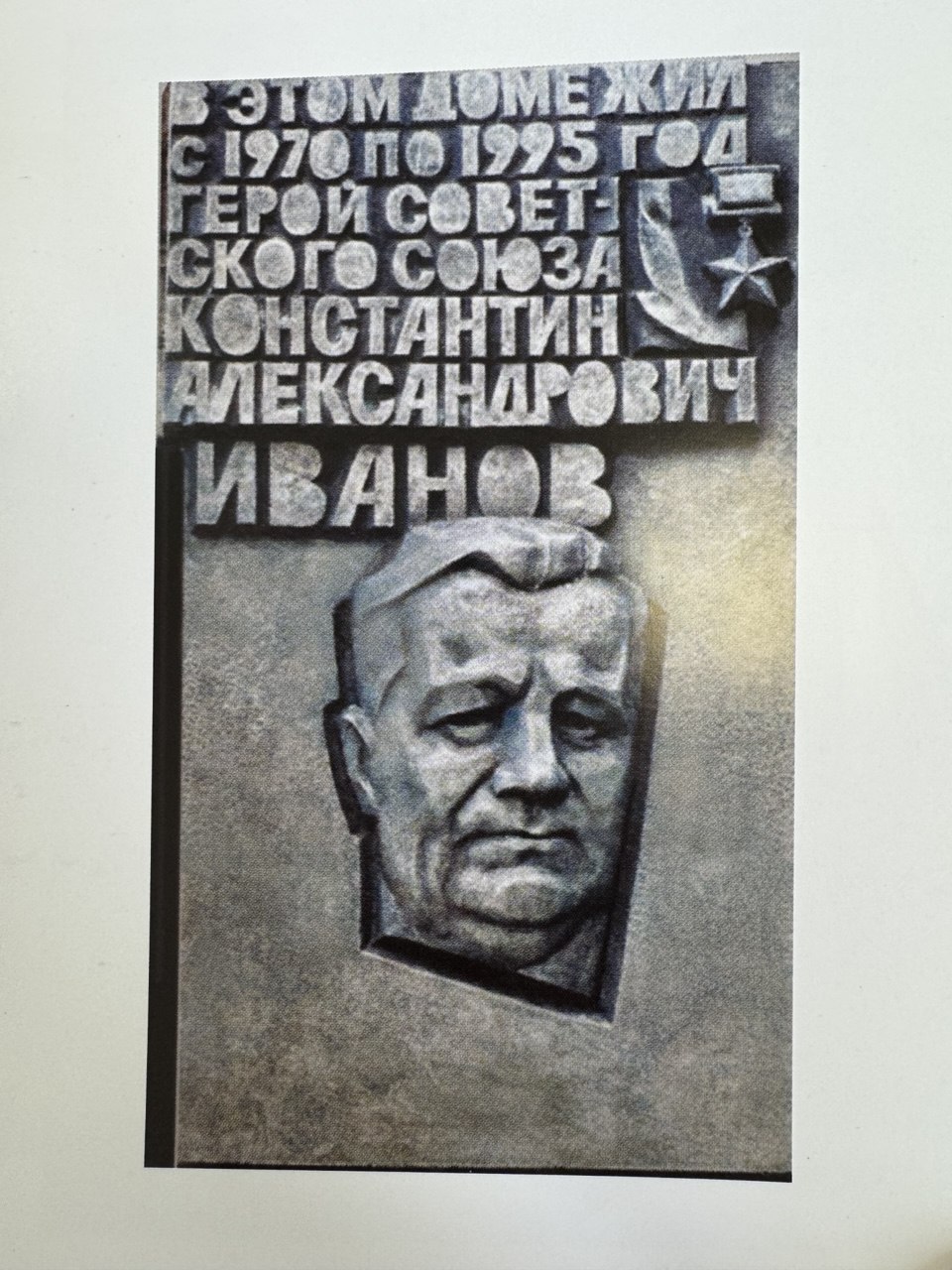 Первую мемориальную доску в память о герое установили в 1996 году. Торжественное открытие памятного знака состоялось 22 июня. Автором мемориальной доски был череповецкий скульптор Александр Шебунин. Её отлили на Череповецком металлургическом комбинате. На памятном знаке был размещен портрет - барельеф К. А. Иванова с надписью: «В этом доме жил с 1970 по 1995 год Герой Советского Союза Константин Александрович Иванов». К сожалению, в неспокойные 1900-е годы украли два экземпляра доски, после чего она была заменена на мраморную с такой же надписью, но без портрета Героя.